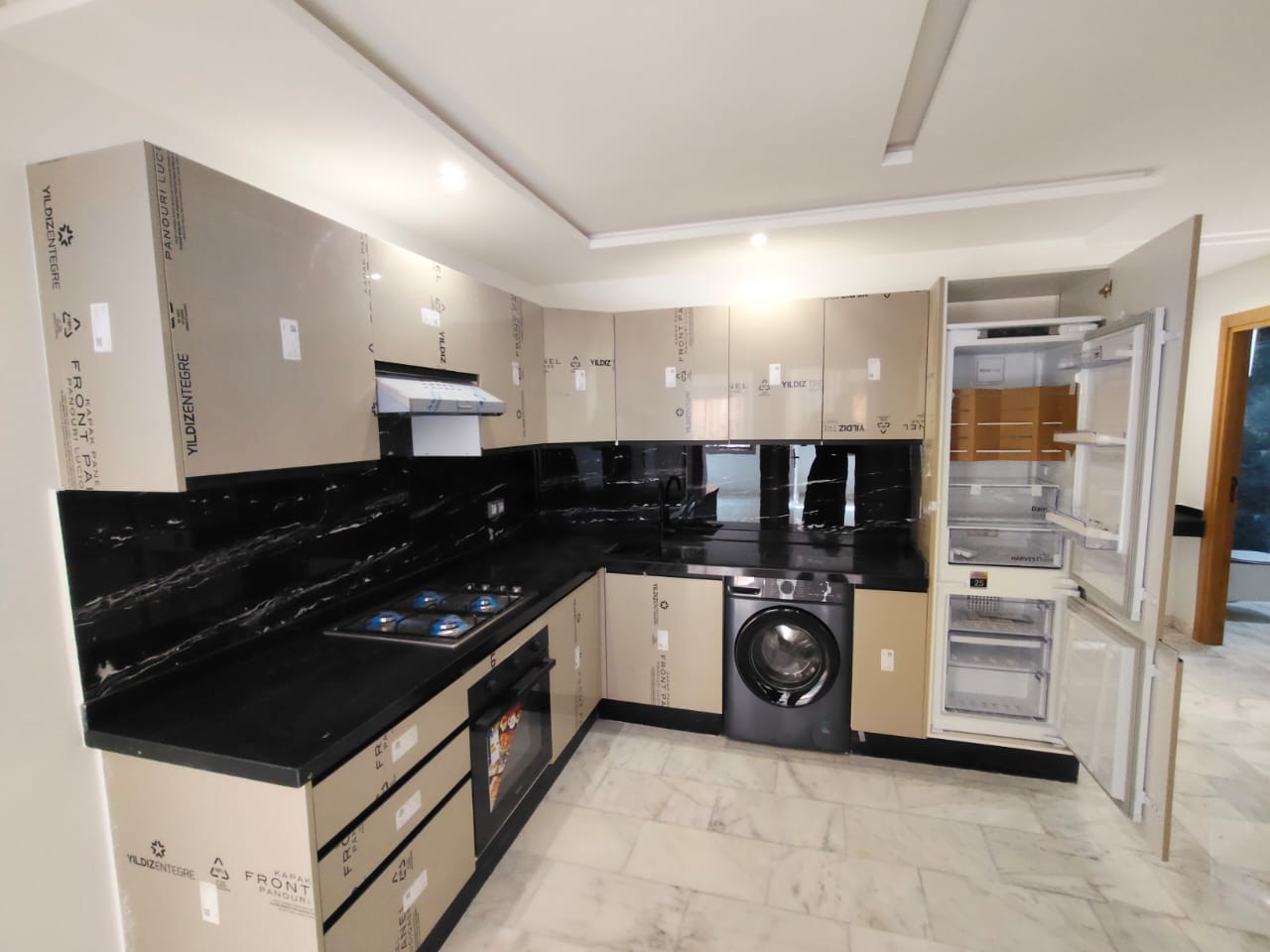 🍳 Cuisine équipée avec plaque, gaz, hotte et frigo