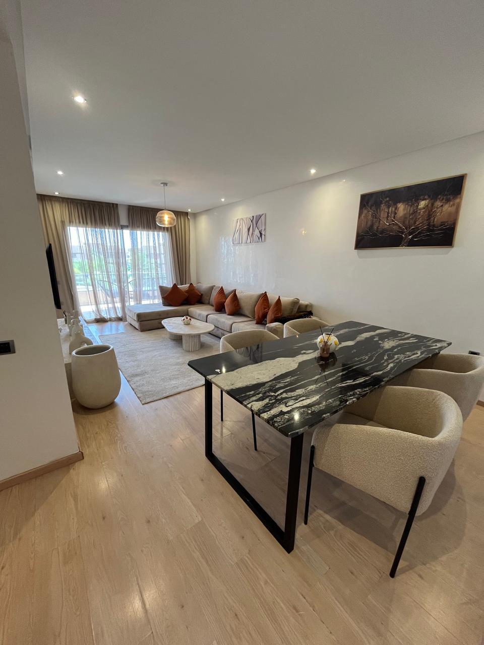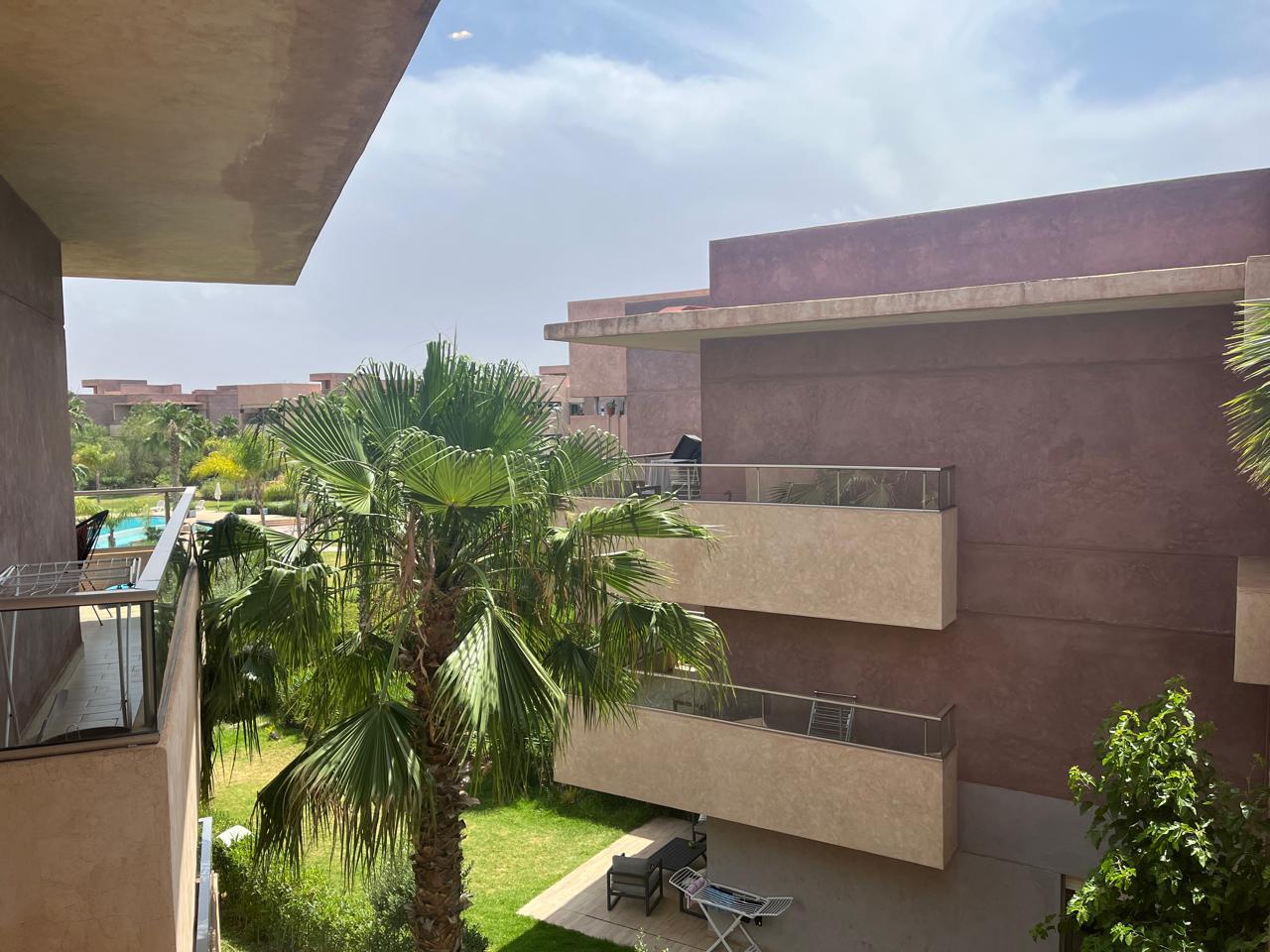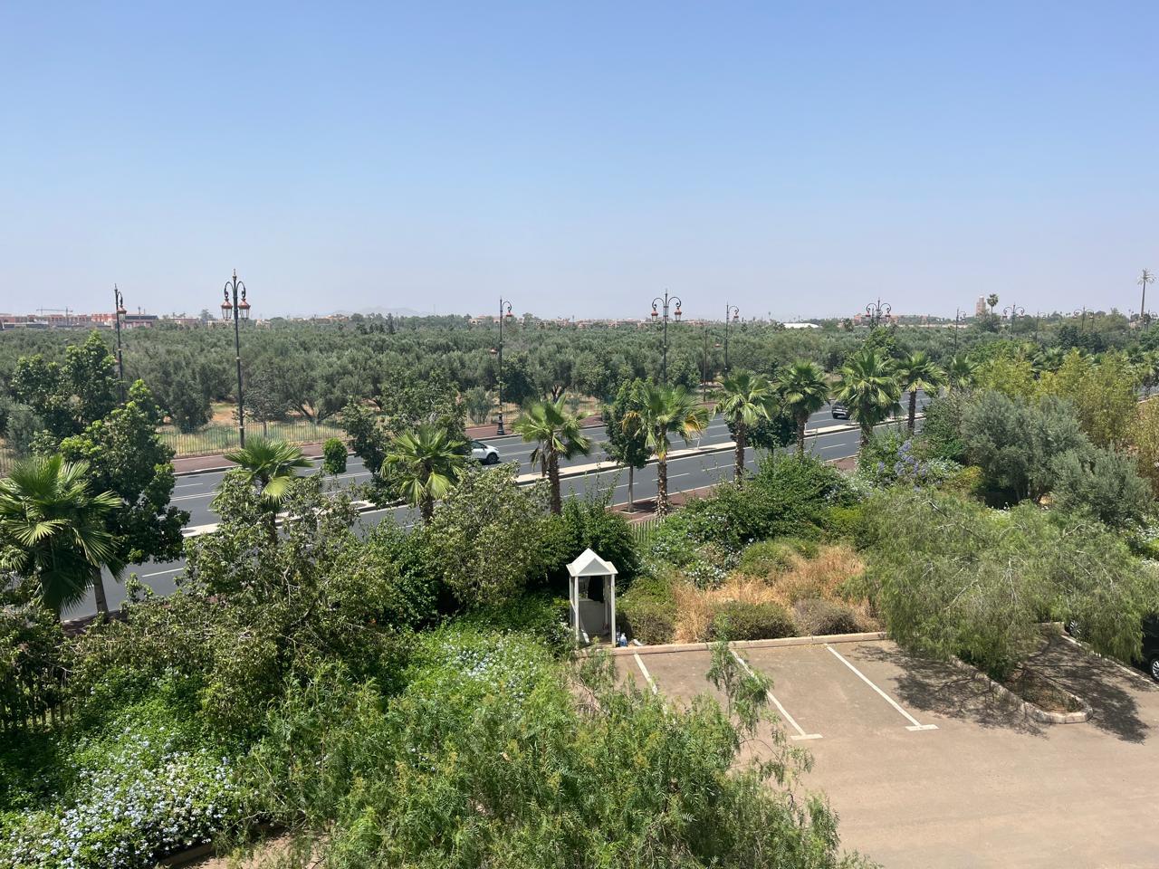 Résidence située idéalement à Marrakech avec vue et accès à la piscine très proche du Menara Mall et pas loin de la gare de train 🚊.